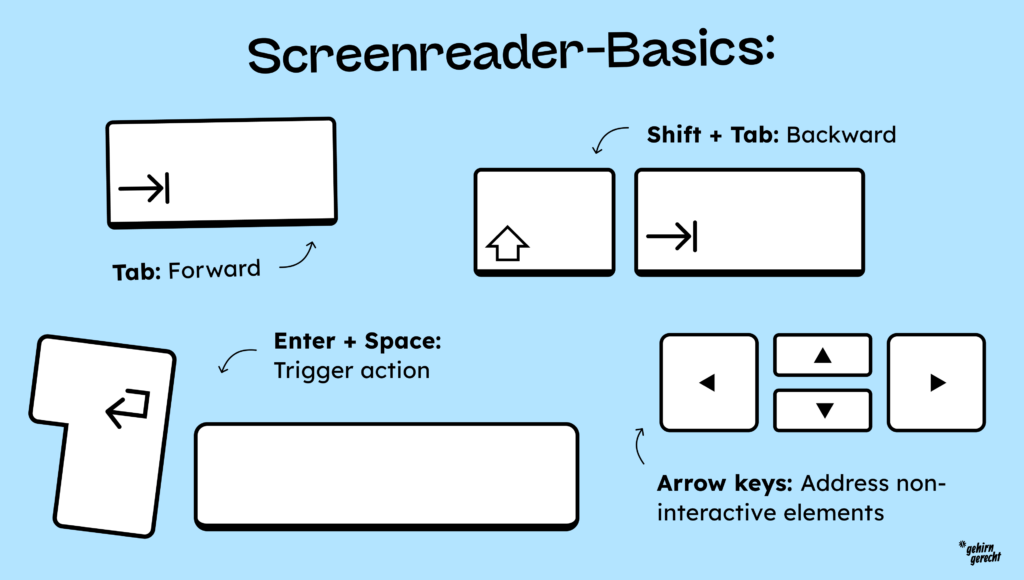 For people who use screen readers daily, navigating websites sequentially would be too cumbersome. Therefore, screen readers offer many additional features, such as special keyboard shortcuts and the ability to sort elements by content type, making navigation significantly more efficient.
